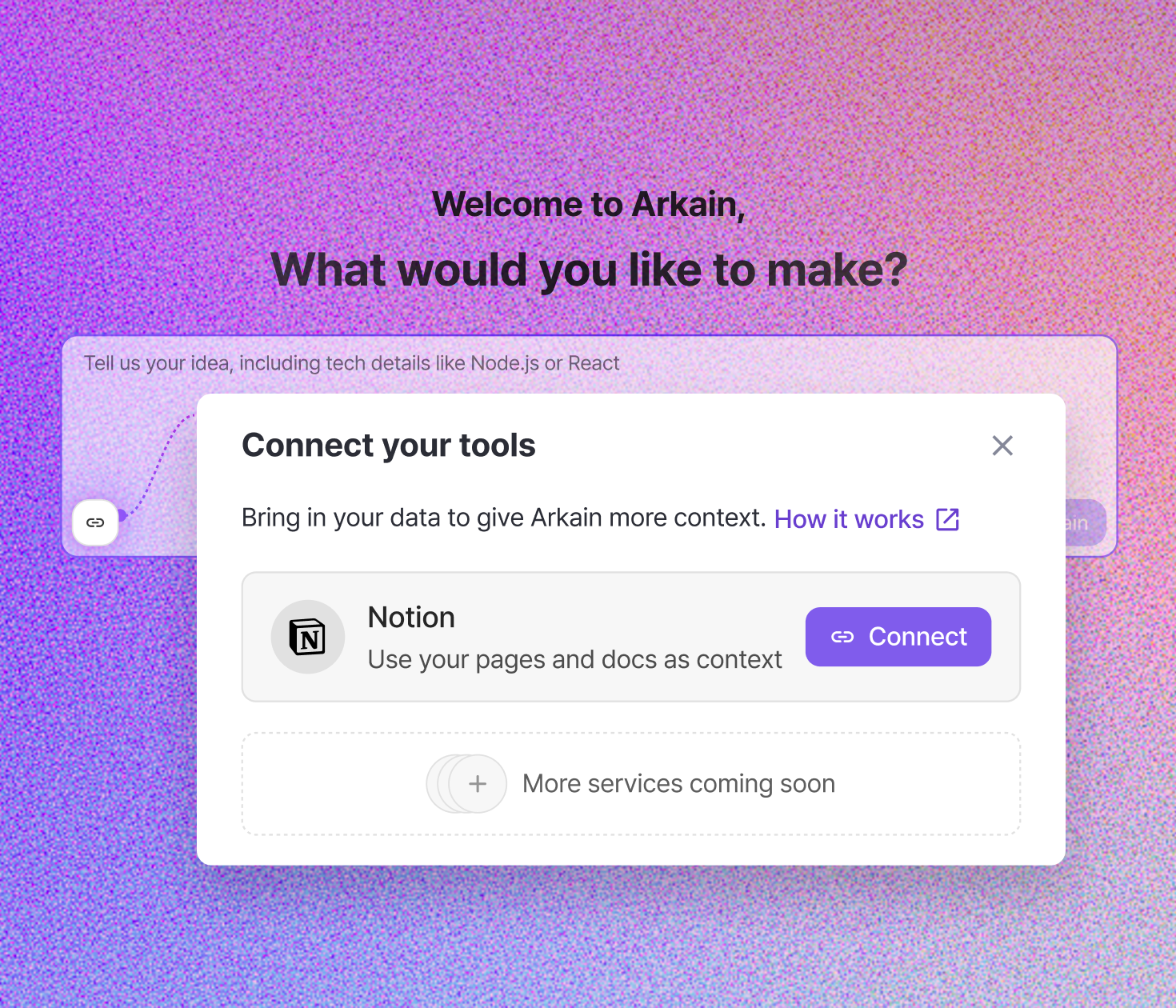 연결하세요복사, 붙여넣기도 필요 없이 평소 쓰던 도구를 연결하면, Arkain이 당신의 기획안을 이해하고 실시간으로 앱을 설계합니다.