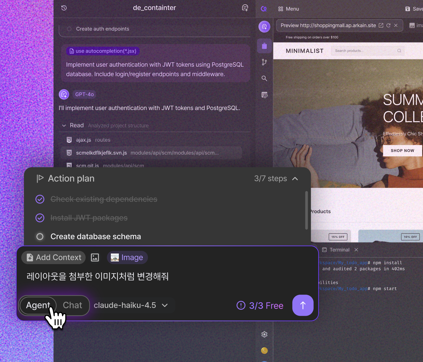 방향만 잡으세요사이드챗으로 궁금한 건 바로 물어보고, 반복 작업은 AI에게 맡기고, 큰 작업은 단계별로 나눠 진행하세요. 개발을 몰라도 처음부터 끝까지 AI와 함께 완성합니다.